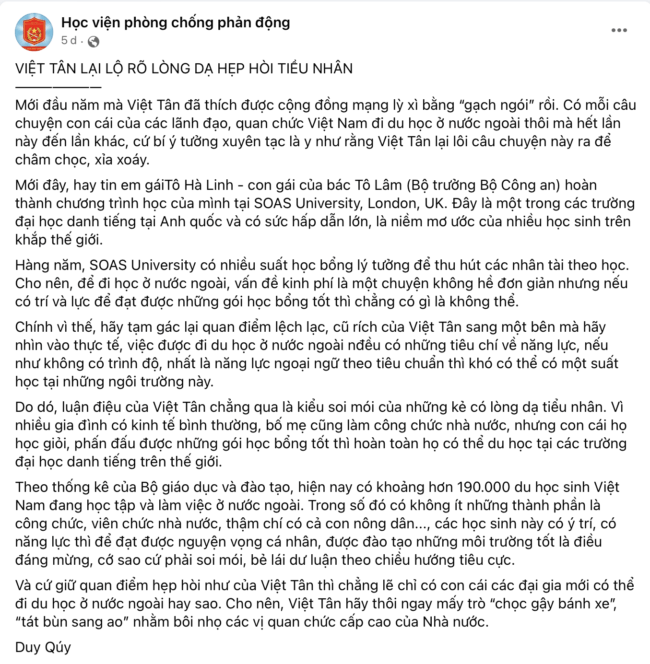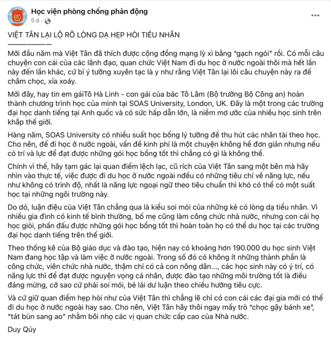Theo trang cá nhân facebook của ái nữ Bộ trưởng Bộ Công an, thì cô học ở SOAS (School of Oriental and African Studies) tọa lạc ở London, Vương quốc Anh – một nơi vốn nổi tiếng là đắt đỏ, với khoản học phí được cho là hàng chục ngàn Mỹ kim/năm. Nếu kể cả chi phí ăn, ở, sách vở,… cho ái nữ mỗi năm, thì con số thực chi chắc phải gấp rất nhiều lần mức thu nhập chính thức/ năm của ông Bộ trưởng.