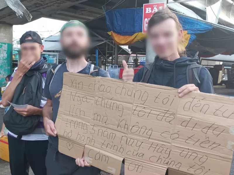 Nội dung trên bảng xin tiền của ba người ngoại quốc là “Xin chào, chúng tôi đến từ Nga, chúng tôi đã đi du lịch mà không có tiền trong 5 năm nay. Hãy ủng hộ hành trình của chúng tôi. (dấu hiệu trái tim). Cảm ơn”. Với nội dung bằng tiếng Việt đúng chính tả và ngữ pháp, nếu đó chính là ngôn từ của ba người này thì chắc hẳn là họ rất yêu Việt Nam nên mới viết được như vậy.