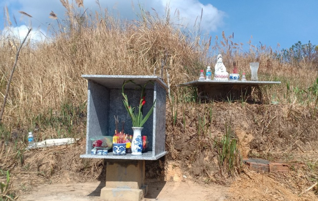 Tấm ảnh cho thấy những mảnh vỡ của miếu thờ cũ đã được dọn dẹp sạch sẽ, một miếu thờ mới được dựng lên đơn sơ, chắp bằng năm tấm đá, có bình hoa nhỏ và bát hương, để cạnh một bó nhang.