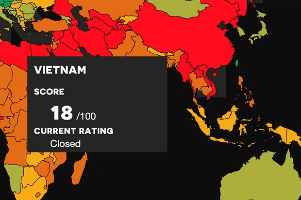 Trong lần đầu tiên không gian tự do dân sự được tổ chức quốc tế có trụ sở chính ở Nam Phi đánh giá bằng thang điểm, Việt Nam trong năm 2022 chỉ được 18 điểm trên thang điểm 100 (là hoàn toàn tự do), chỉ xếp trên sáu quốc gia/vùng lãnh thổ trong tổng số 26 quốc gia/vùng lãnh thổ ở châu Á: Bắc Triều Tiên- 2, Lào- 7, Myanmar và Trung Quốc- 12, Afganistan- 13, và Hồng Kông: 15.