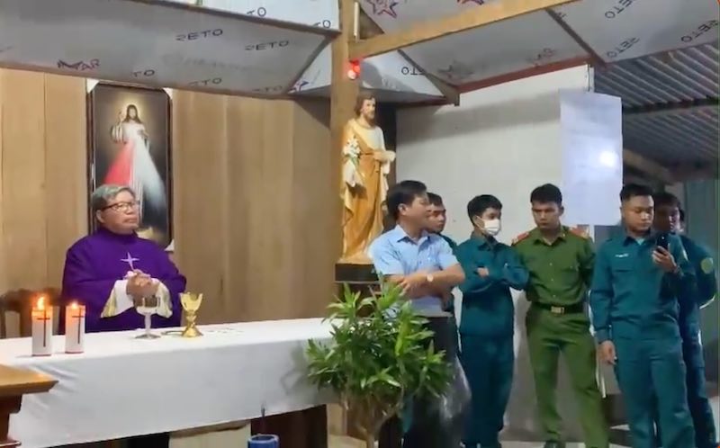 Trong khi đó, vị linh mục được cho biết là Linh mục Lê Tiên nhỏ nhẹ yêu cầu “các anh muốn làm gì thì đợi sau thánh lễ”, và “các anh cứ lập biên bản đi rồi chúng tôi ký”, nhưng một phụ nữ đã sỗ sàng xông lên bàn thờ, đóng sập cuốn sách lễ linh mục đang đọc và đem đi, trong khi một người đàn ông khác trong nhóm cán bộ đi ra phía cột cắm điện rút các dây điện ra.