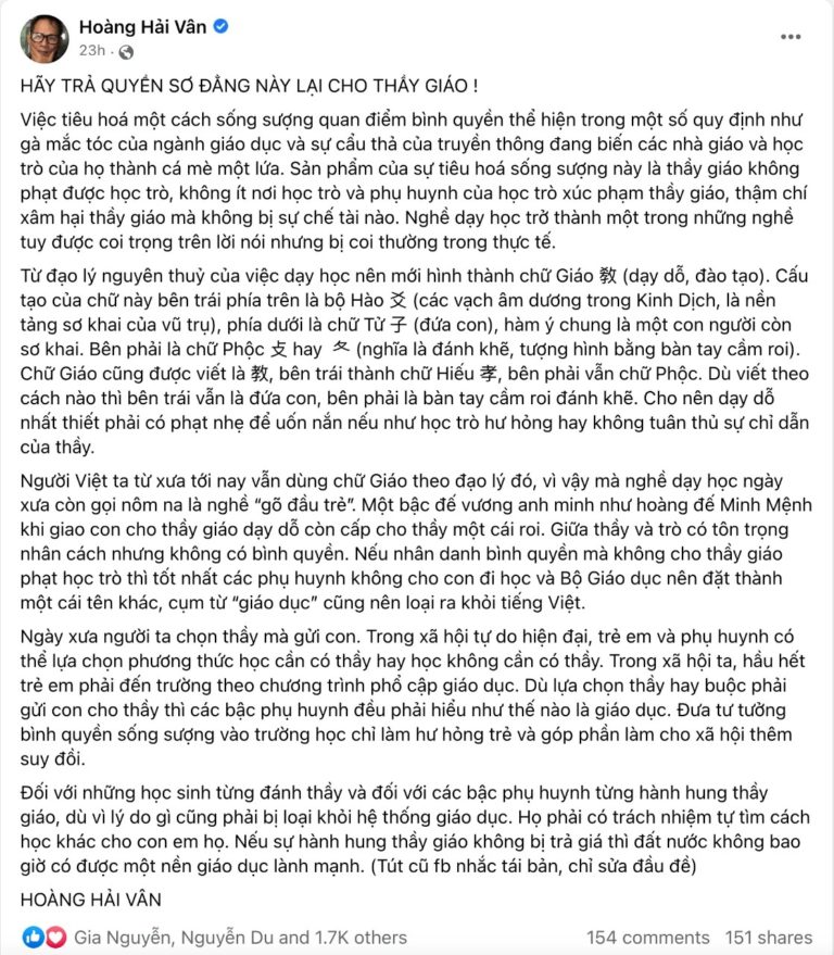 Sau khi vỡ ra vụ việc một cô giáo ngang nhiên cắt tóc học trò trên bục giảng, nhà báo Hoàng Hải Vân đăng bài “HÃY TRẢ QUYỀN SƠ ĐẲNG NÀY LẠI CHO THẦY GIÁO!”. Là quyền gì? Nhà báo HHV bảo, là quyền “phạt học trò”.