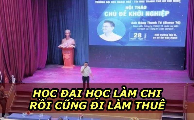Mới đây nhất, một diễn giả khách mời của trường ĐH Ngoại ngữ – Tin học TPHCM (HUFLIT) tiếp tục xoáy sâu vào vấn đề này. Khi lập luận trước hàng trăm sinh viên rằng “trong 30 nhân viên của anh, không ai có tấm bằng đại học. Vậy tụi em học đại học làm gì rồi sau này cũng đi làm thuê cho người ta?”