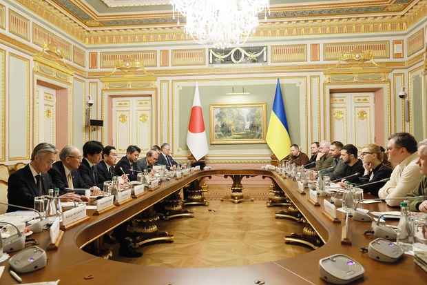 Trong khi đó, tại Ukraine, Thủ tướng Nhật Kishida Fumio và Tổng thống Ukraine Volodymir Zelenskyi cũng đã ra tuyên bố chung, trong đó có bốn mục lớn là Đoàn kết chống Nga xâm lược Ukraine, Hợp tác trong bối cảnh Nhật Bản đảm nhiệm Chủ tịch G7, Mở rộng hợp tác song phương, và Hợp tác trên trường khu vực và quốc tế.