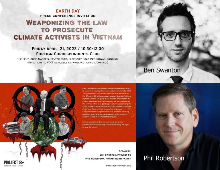 Một cuộc họp báo sẽ được tổ chức vào ngày 21 tháng 4 tại câu lạc bộ báo chí ở Bangkok, Thái Lan, nhằm lên án nhà cầm quyền Việt Nam sử dụng luật pháp như một loại vũ khí để truy tố các nhà hoạt động khí hậu.