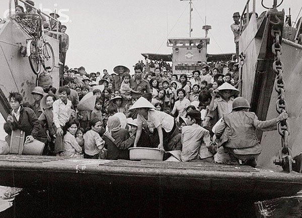 Khoảng 6 giời chiều ngày 26/3, tôi vứt khẩu súng xuống biển, hai anh em tôi là 2 người cuối cùng rời xà lan leo lên tầu Mỹ. Tầu quá đông người, nghe nói có tới 7 ngàn người. Những người lên trước được đưa xuống các hầm tầu. Tôi và người “cận vệ” chia nhau hai hướng để tìm vợ con tôi, điểm hẹn là chỗ khởi hành. Trên tầu có tới mấy cái hầm, rộng và sâu. Leo xuống, leo lên bằng cái thang sắt gắn sát vách tầu cũng mỏi rã cánh tay. Hầm tầu sâu và rộng, rất đông người. Muốn tìm thân nhân phải leo thang xuống tận nơi. Tôi mới leo xuống tìm kiếm được một hầm và leo lên thì gặp người “cận vệ” cho biết “Em đã tìm thấy chị và mấy cháu rồi, ở dưới hầm đằng kia!” Tôi theo anh ta leo xuống hầm. Dễ có mấy trăm người dưới hầm. Người nằm ngồi la liệt. Chưa thấy ai đi tiêu ra sàn, nhưng tôi thấy người ta đi tiểu ra sàn. Dù sao tình trạng cũng rộng rãi thoải mái hơn trong nhà tù. Trưa hôm sau tới Cam Ranh.