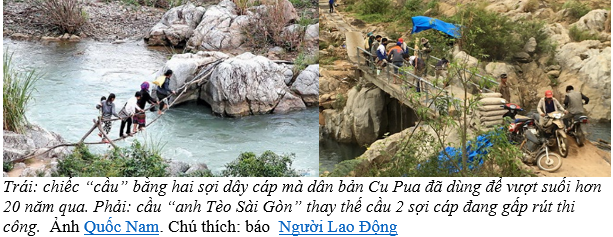Trước kia, học sinh và người dân ở thôn CuPua đi lại, vận chuyển nông sản phải đánh đu trên hai sợi cáp này để vượt sông Đak Rông, đây là con đường độc đạo duy nhất nối thôn CuPua với bên ngoài… đường vào thôn CuPua nay đã đổi khác, hai sợi cáp hoen gỉ đã được thay thế bởi một chiếc cầu và đoạn đường bêtông thẳng tắp.