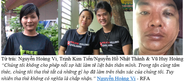 - Vũ Huy Hoàng: Tôi từng bị mời lên trụ sở công an nhiều lần chỉ để bị hạch hỏi về các quan điểm chính trị. Bị gây khó khăn trong công việc mưu sinh. Tôi từng bị bắt, bị đánh, bị ném gạch đá chất bẩn vào nhà nhiều lần chỉ vì tham gia biểu tình ôn hoà bảo vệ môi trường, bảo vệ chủ quyền biển đảo trước sự xâm lấn của Tàu cộng.