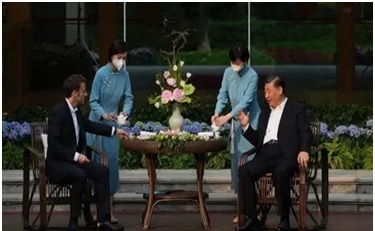 Không biết có phải vì trà ngon và hai cô xẩm hầu trà quá xinh đẹp đã làm ông Tổng thống Macron vội quên lập trường chung của Âu châu và ý riêng của ông là thuyết phục Xi khuyên Putin rút quân đội về, trả lại đất đai nguyên vẹn của Ukraine cho Ukraine, mà lại bọc theo Xi về vấn đề Đài Loan và ông đã tuyên bố « Đài loan không phải là vấn đề của Âu châu và Âu châu không nên đi theo hướng của Hoa Kỳ ». Lời tuyên bố của ông thật sự làm hài lòng Xi và lập tức làm cho Âu châu và cả thế giới phản đối kịch liệt. Hôm sau, ông qua Amsterdam, Hòa Lan, đọc diễn văn về xây dựng kinh tế Âu châu, bị sinh viên và dân chúng Hòa Lan la ó phản đối làm cho ông đã phải ngưng ngang.