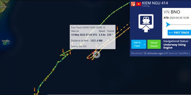 Tàu Kiểm ngư Việt Nam 414 vào tối ngày 10/5 (giờ Việt Nam) được ghi nhận đi theo tàu khảo sát Trung Quốc Xiang Yang Hong (Hướng Dương Hồng) 10 khi tàu này đang ở trong Vùng đặc quyền kinh tế của Việt Nam, cách Côn Đảo khoảng 120 hải lý. Ảnh Marine Traffic do RFA chụp lại cho thấy như vừa nêu.