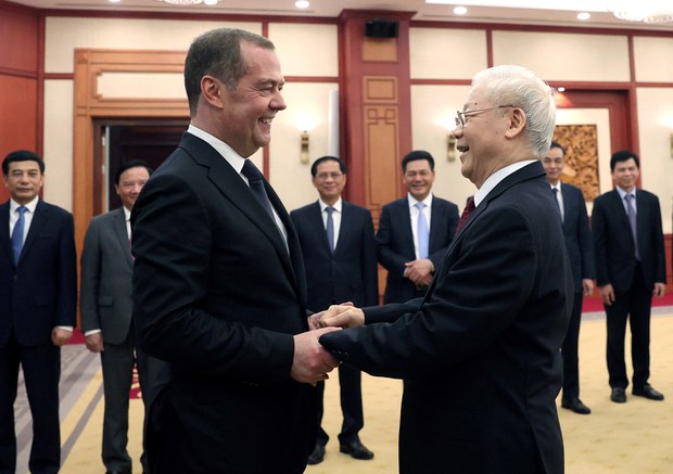 “Trong chính sách đối ngoại của mình, Việt Nam coi trọng quan hệ hữu nghị truyền thống, Đối tác chiến lược toàn diện với Nga. Đảng Cộng sản Việt Nam coi trọng việc phát triển quan hệ với các chính đảng ở Nga, trong đó có Đảng “Nước Nga Thống nhất”, làm nền tảng chính trị cho quan hệ lâu dài và bền vững giữa hai nước. Tổng Bí thư Nguyễn Phú Trọng trân trọng đề nghị Chủ tịch Đảng “Nước Nga Thống nhất” Medvedev chuyển lời thăm hỏi tới Tổng thống Putin và các Nhà Lãnh đạo Nga,” theo báo điện tử của Đảng Cộng sản Việt Nam hôm 22/5/2023.