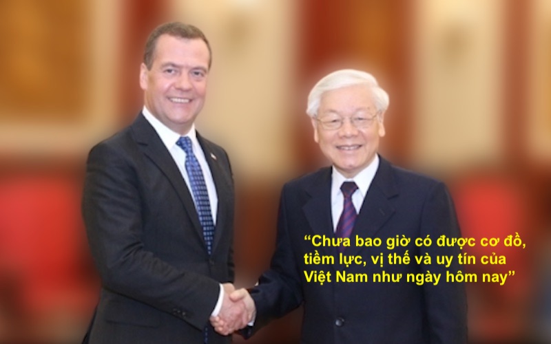 “Tổng Bí thư thông báo với Chủ tịch Đảng Medvedev những thành tựu phấn đấu của Nhà nước, toàn thể nhân dân Việt Nam dưới sự lãnh đạo của Đảng Cộng sản Việt Nam để đạt được kết quả chưa bao giờ có được cơ đồ, tiềm lực, vị thế và uy tín của Việt Nam như ngày hôm nay” – trích thông cáo báo chí của Văn phòng Trung ương Đảng về nội dung hội đàm của Tổng bí thư Nguyễn Phú Trọng với Chủ tịch Đảng nước Nga thống nhất, Phó Chủ tịch Hội đồng An ninh Liên bang Nga Dmitry Medvedev, chiều 22-5-2023 tại Hà Nội.