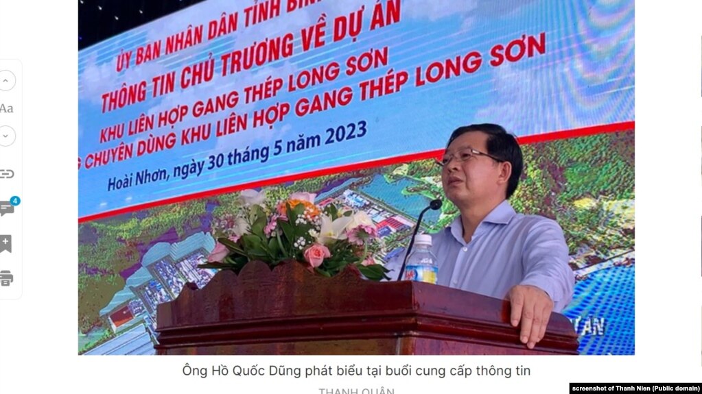 VNExpress, Thanh Niên và các báo cho hay Bí thư Tỉnh ủy Bình Định Hồ Quốc Dũng cam kết dự án thép – công suất 5,4 triệu tấn một năm – sẽ không tác động xấu môi trường địa phương.