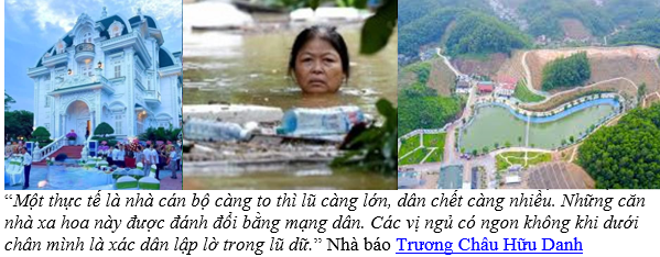 Trên khắp dải đất hình chữ S này, nhà gỗ triệu đô không hiếm. Nhưng những căn nhà này không thuộc về giới siêu giàu, giới doanh nhân. Những căn nhà này, trớ trêu thay, lại là của cán bộ. Sau lệnh đóng cửa rừng, các món đồ gỗ, nhà gỗ này càng trở nên vô giá. Một thực tế là nhà cán bộ càng to thì lũ càng lớn, dân chết càng nhiều. Những căn nhà xa hoa này được đánh đổi bằng mạng dân. Các vị ngủ có ngon không khi dưới chân mình là xác dân lập lờ trong lũ dữ?”