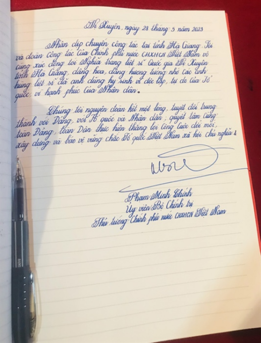 Lưu bút của Thủ tướng Phạm Minh Chính tại Nghĩa trang liệt sĩ quốc gia Vị Xuyên ngày 28/5/2023. Nguồn: Chính Trị-Văn Hoá -Xã Hội/ Tik Tok