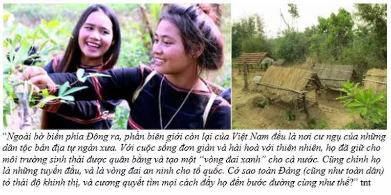 Ngoài bờ biển phía Đông ra, phần biên giới còn lại của Việt Nam đều là nơi cư ngụ của những dân tộc bản địa tự ngàn xưa. Với cuộc sống đơn giản và hài hoà với thiên nhiên, họ đã giữ cho môi trường sinh thái được quân bằng và tạo một “vòng đai xanh” cho cả nước. Cũng chính họ là những tuyến đầu, và là vòng đai an ninh cho tố quốc. Cớ sao toàn Đảng (cũng như toàn dân) tỏ thái độ khinh thị, và cương quyết tìm mọi cách đẩy họ đến bước đường cùng như thế?