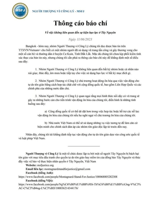 Ông Y Quynh Bdap, sáng lập viên nhóm Người Thượng Vì Công Lý ra thông cáo cho biết tổ chức của ông và cá nhân ông Y Quynh Bdap không liên quan đến sự kiện kiện bạo lực ở Tây Nguyên-Việt Nam vào ngày 11/06/2023.