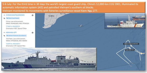 Tàu hải cảnh lớn nhất thế giới của Trung Quốc CCG 5901 vào vùng biển Việt Nam và tiến gần tới các lô dầu khí ở phía Nam Việt Nam trong các ngày 5 và 6 tháng 7 trong khi tàu kiểm ngư 277 của Việt Nam đeo bám.