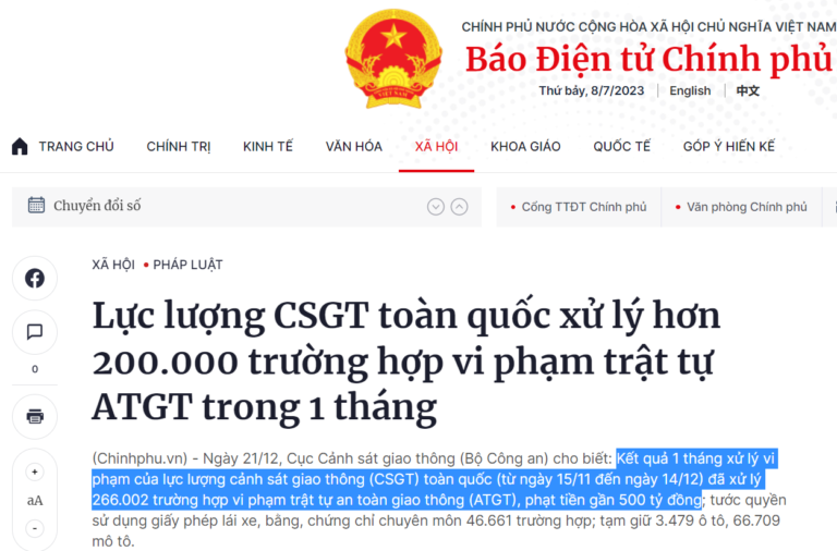 Còn ở Toàn quốc thì “hoành tráng” hơn. Trong bức ảnh cuối chụp màn hình báo điện tử Chính phủ, nội dung có đoạn ghi: “Kết quả 1 tháng xử lý vi phạm của lực lượng cảnh sát giao thông (CSGT) toàn quốc (từ ngày 15/11 đến ngày 14/12) đã xử lý 266.002 trường hợp vi phạm trật tự an toàn giao thông (ATGT), phạt tiền gần 500 tỷ đồng“.