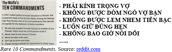 Tháng 11 năm 2007, cảnh sát Sicily tìm được (trong sào huyệt của ông trùm Salvatore Lo Piccolo) “Mười Điều Răn” (Ten Commandments) của đám Mafia địa phương. Đọc xong, quí bà và quí cô đều phải xuýt xoa và tấm tắc khen: Phải kính trọng vợ/ Không được dòm ngó vợ bạn/ Không được lem nhem về tiền bạc/ Luôn giữ đúng hẹn/ Không bao giờ nói dối …