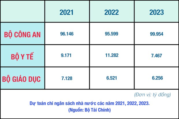 Theo số liệu do Bộ Tài chính công bố, năm 2021, dự toán chi ngân sách cho Bộ công an là khoảng 96 ngàn tỷ đồng, gấp hơn 10 lần Bộ y tế (khoảng 9,1 ngàn tỷ đồng) và Bộ giáo dục là 7,1 ngàn tỷ đồng.