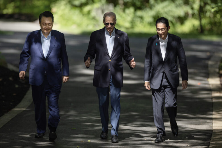 Vào Ngày 18 Tháng Tám, lần đầu tiên Tổng thống Biden mời Tổng thống Nam Hàn và Thủ tướng Nhật Bản đến Trại David, để gửi một thông điệp mạnh mẽ đến Trung Quốc. Dưới sự trung gian của Hoa Kỳ, cả Nam Hàn và Nhật Bản đã đồng ý gạt bỏ bất đồng lịch sử, để cùng nhau tăng cường hợp tác về quân sự. Các quan chức công bố hợp tác mở rộng, không chỉ trong các cuộc tập trận quân sự chung và chia sẻ tình báo, mà còn trong lĩnh vực trí tuệ nhân tạo, chuỗi cung ứng, an ninh mạng, và kinh tế.