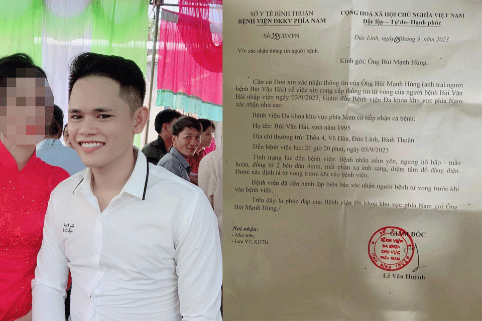 “Bệnh viện Đa khoa khu vực phía Nam có tiếp nhận ca bệnh: Họ tên: Bùi Văn Hải, sinh năm 1995, Địa chỉ thường trú: Thôn 4, Vũ Hòa, Đức Linh, Bình Thuận, Đến Bệnh viện lúc: 21 giờ 20 phút, ngày 03/9/2023. Tình trạng lúc đến bệnh viện: Bệnh nhân nằm yên, ngưng hô hấp – tuần hoàn, đồng tử hai bên giãn 4mm, mắt phản xạ ánh sáng, điện tâm đồ đẳng điện. Được xác định là tử vong trước khi vào bệnh viện. Bệnh viện đã tiến hành lập biên bản xác nhận người bệnh tử vong trước khi vào bệnh viện.”