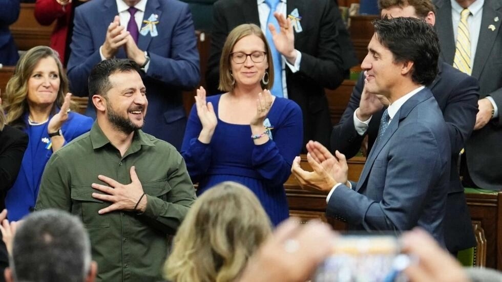Sau Washington, Mỹ, tổng thống Ukraina Volodymyr Zelensky hôm qua, 22/09/2023, công du Canada. Sau khi hội đàm với thủ tướng Justin Trudeau, ông Zelensky đã được đón chào nồng nhiệt tại Nghị Viện Canada.