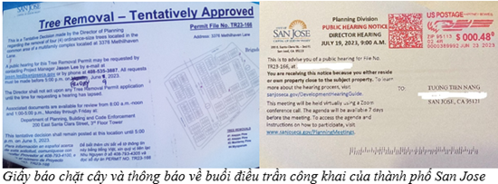 Tháng rồi chỉ vì muốn chặt hai ba cây thông kế bãi đậu xe mà họ dán giấy tùm lum, cho biết trước là chúng sẽ bị đốn hạ. Sau đó, mọi người còn nhận được thông báo, và khuyến khích tham dự vào một buổi điều trần công khai (public hearing) nữa cơ!