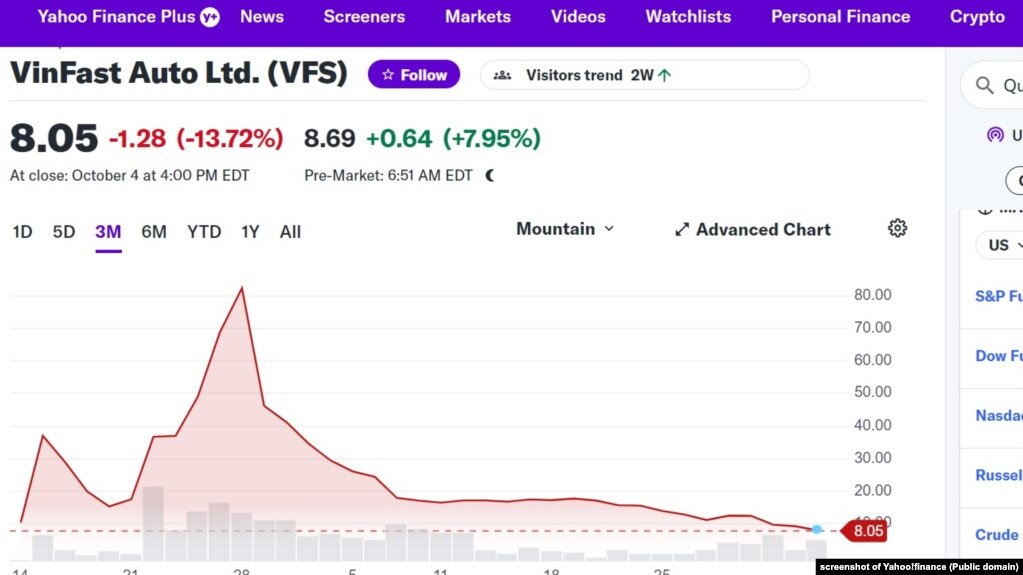 Kết thúc phiên giao dịch trên sàn Nasdaq hôm 4/10, giá của VFS là 8,05 đô la, giảm hơn 26% so với mức ở thời điểm thị trường đóng cửa trong ngày giao dịch cuối cùng của tuần trước, 29/9.