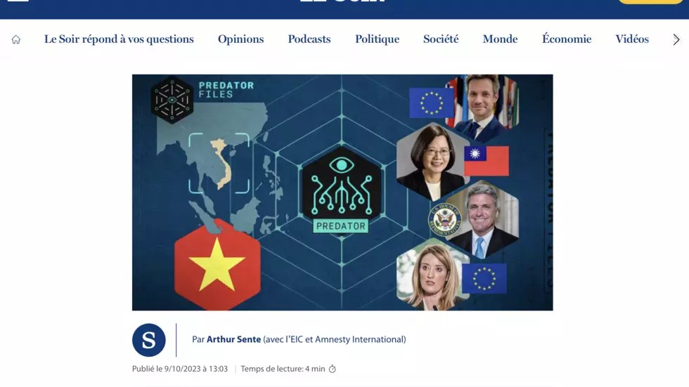 Trang Le Soir của Bỉ : Predator Files : les manœuvres du Vietnam pour espionner l’Europe, dont la présidente du Parlement européen (Predator Files : các cách Việt Nam do thám châu Âu, trong đó có nữ chủ tịch Nghị Viện Châu Âu).