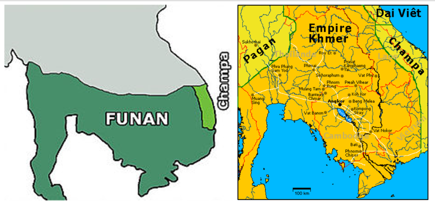 Hình 2: trái, sơ đồ Vương quốc Phù Nam vào khoảng thế kỷ thứ III bao gồm các vùng đất phía nam Việt Nam, Cam Bốt sang tới Thái Lan và bán đảo Mã Lai. Phù Nam chỉ tồn tại tới thế kỷ thứ VII sau đó bị Chân Lạp / Chenla thôn tính; kế tục Chân Lạp là một Đế Quốc Khmer hùng mạnh ra đời từ thế kỷ thứ IX; phải, sơ đồ Vương quốc Khmer với diện tích bao trùm nam Việt Nam, Cam Bốt, Lào, Thái Lan và bán đảo Mã Lai, và rồi tiêu vong vào thế kỷ thứ XV. Kế tiếp chỉ còn lịch sử một Vương quốc Cam Bốt thăng trầm cho tới ngày nay. Nguồn: Wikipedia