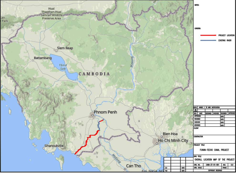 Chính phủ Hoàng Gia Cambodia, thông qua Bộ Công chánh và Vận tải [Public Work and Transport / MPWT] đã gửi một Thông Báo ký ngày 8 tháng 8 năm 2023 tới Tiến sĩ Anoulak CEO Ban Thư Ký Ủy Hội Sông Mekong về một Dự án Kênh đào nội địa “Funan Techo Canal” (1) với các chi tiết kỹ thuật như sau: