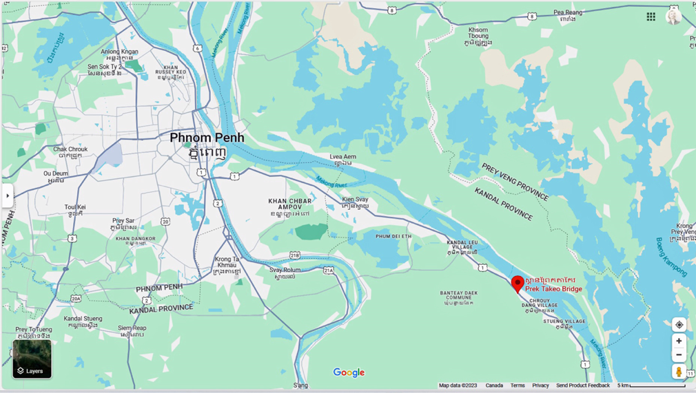 Hình 4: hình chụp cắt từ Google Maps, và chấm đỏ nơi tỉnh Prek Takeo trên bản đồ là khởi điểm của con kênh đào Funan Techo dài 180km.