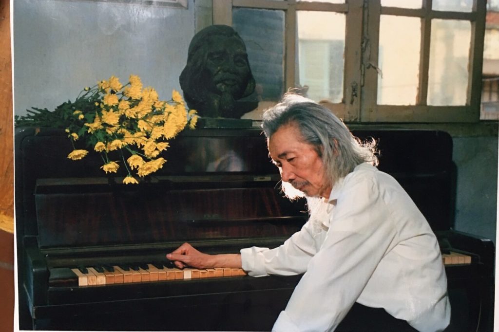 Dắt xe đạp len lách qua những gánh hàng rau của cái chợ cóc tự phát vỉa hè phố Yết Kiêu, tôi lại lên những bậc cầu thang đổ ra góc phố. Vẫn cánh cửa gỗ cũ kĩ. Vẫn bà Băng, người bạn đời chia sẻ mọi hoạn nạn với Văn Cao ra mở cửa. Vẫn bức tượng chân dung do nhà điêu khắc Phạm Văn Hạng ở Đà Nẵng tạc, tặng ông, đặt trên chiếc đàn piano cũ. Ở phòng khách lần này có một cái mới là thêm bức ảnh đẹp do Lê Quang Châu chụp Văn Cao ngồi bên đàn với bình hoa cúc vàng đến ngẩn ngơ. Tôi chợt nhận ra màu vàng của hoa cúc mùa thu, sao đồng điệu với Văn Cao đến thế.