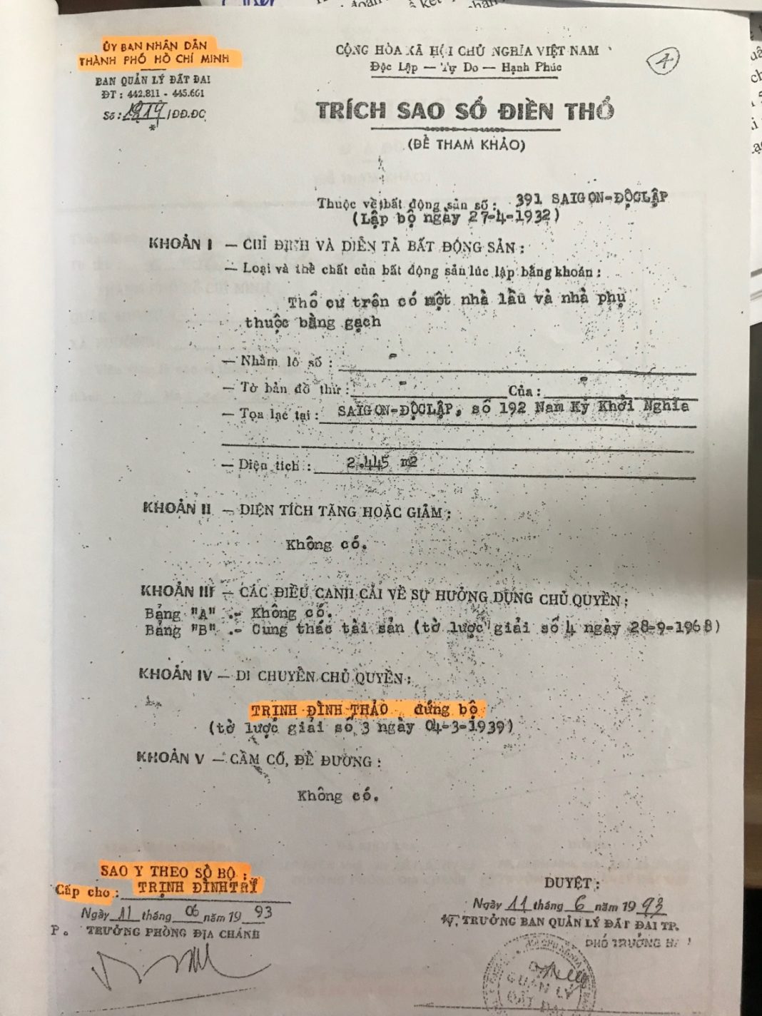 Ảnh: Sổ Điền Thổ căn nhà số 192 Nam Kỳ Khởi Nghĩa của ông Trịnh Đình Thảo, sau 45 năm vẫn không đòi được. Hiện căn nhà này thuộc khu đất vàng, nằm trong tay một công ty con của Tập đoàn Vạn Thịnh Phát, xây chung cư cao tầng. Nguồn: SGGP