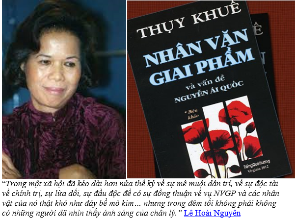 (**) Theo chỗ hiểu biết của chúng tôi, trong công trình biên khảo này, chị Thụy Khê đã không nhắc đến một số tên tuổi quen thuộc khác, cũng có liên quan ít nhiều đến phong trào Nhân Văn như Bùi Quang Đoài, Thanh Châu, Hoàng Huế, Hoàng Yến, Hữu Loan, Tạ Hữu Thiện … Tuy nhiên, nếu nói theo Lê Đạt (“…ở đất nước Việt Nam, những người đau khổ vì Nhân Văn chắc rất nhiều, không thể đếm xuể được”) thì sự sai sót – dù vì bất cứ lý do gì – là điều rất khó tránh khỏi.