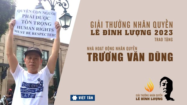 Nhà hoạt động bất đồng chính kiến Trương Văn Dũng (hay còn gọi là Trương Dũng), người đang thụ án sáu năm tù giam về tội danh “tuyên truyền chống nhà nước,” được tổ chức Việt Nam Canh tân Cách mạng Đảng (tức đảng Việt Tân) trao giải thưởng Lê Đình Lượng năm nay với chủ đề “75 Năm Quốc Tế Nhân Quyền- Tự Do, Bình Đẳng & Công Lý cho Việt Nam.”
