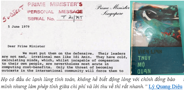 (Phải nói, phải nhắc đi nhắc lại, cho nhân dân và các nhà lãnh đạo trên toàn thế giới biết rằng chính quyền nước Cộng hòa Xã hội Chủ nghĩa Việt Nam chính là kẻ tích cực xúc tiến cuộc di tản ồ ạt này, gây thiệt hại nặng nề cho các nước Đông Nam Á… Họ có đầu óc lạnh lùng tính toán, không hề biết động lòng với chính đồng bào mình, nhưng làm phép tính giữa chi phí và lời thu về thì rất nhanh.” Prime Minister Lee Kuan Yew of Singapore letter to MT. Trans. Phạm Thị Hoài.)