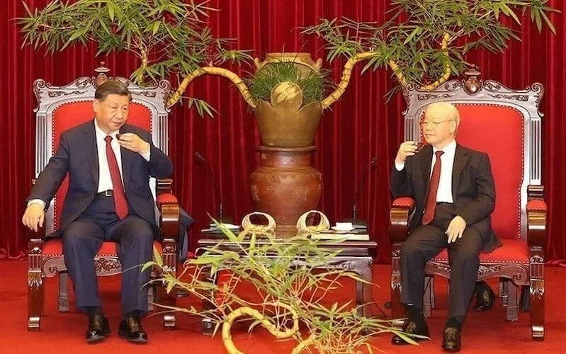 Hình ảnh Tập Cận Bình cùng ngồi uống trà với Nguyễn Phú Trọng ở Hà Nội với những họa tiết mang tính biểu tượng của “rồng tre” hồi trung tuần tháng 12-2023, gợi rõ hơn về ví von gấu trúc Bắc Kinh có mồi ngon khoái khẩu là tre Hà Nội cho gặm nhấm dần.