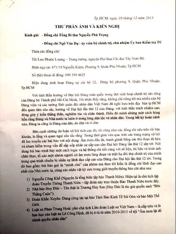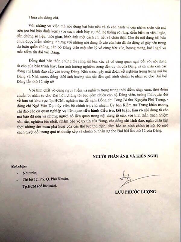 Đỉnh điểm, xuất hiện thư kiến nghị của trung tướng Lưu Phước Lượng, yêu cầu Trung ương điều tra, ngăn chặn âm mưu “lũng đoạn nhân sự, can dự chính trường” của Nguyễn Công Khế. Tướng Lượng nguyên là Phó tư lệnh quân khu 9, Bộ quốc phòng, Phó Trưởng ban Chỉ đạo Tây Nam bộ.