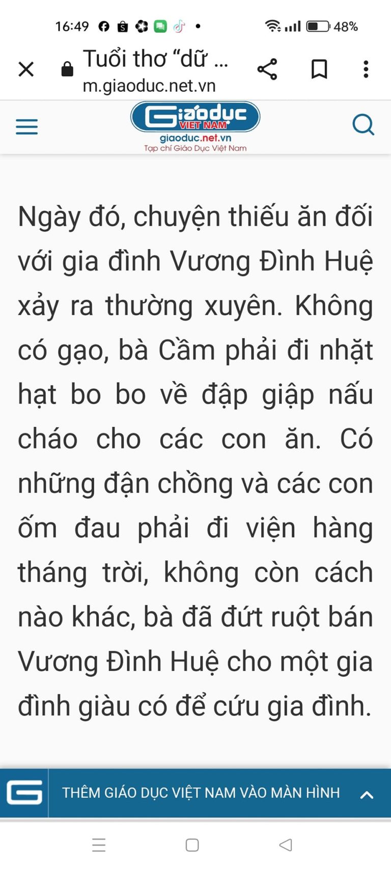 Có học trò viết: “Chị Dậu bán chó để cứu chồng thì có thể chia sẻ, cảm thông, nhưng bán con để cứu chồng là nhẫn tâm”. Cô giáo cho ăn hột vịt lộn vì bình luận như vậy là xúc phạm tấm gương người mẹ Việt Nam. Học trò chua chát viết trên nhóm Zalo: “Đề yêu cầu trình bày ‘suy nghĩ của em’, nhưng lại chấm theo suy nghĩ của cô giáo!”
