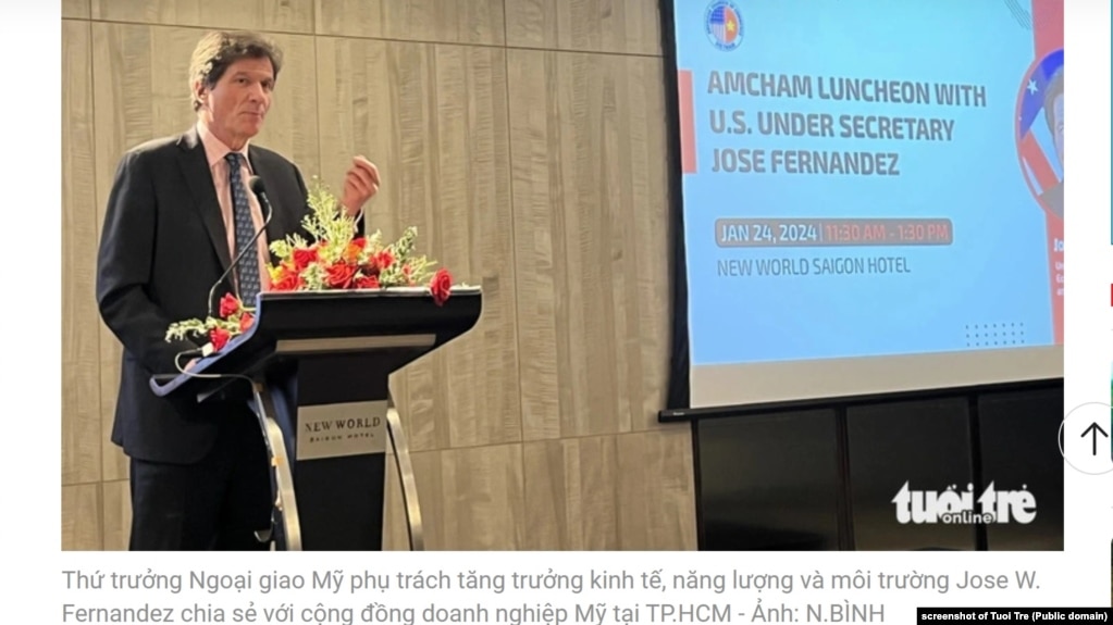 Thứ trưởng Ngoại giao Mỹ Jose Fernandez hiện đang thăm Việt Nam, thúc đẩy hợp tác về thương mại, kinh tế, năng lượng sạch và tái tạo, chuỗi cung ứng, và chip, bán dẫn, hai trang tin Tuổi Trẻ và Thế Giới Tiếp Thị tường thuật hôm 24/1.