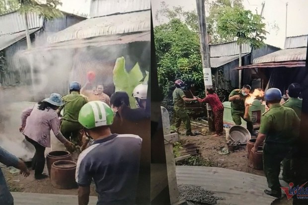 Công an xã đến để can thiệp. Bà Đỗ Thị Phượng được nói đả dùng giẻ tẩm dầu đốt ném vào công nhân; còn bà Lê Thị Phân tạt nước sôi có pha mắm tôm tạt vào Phó Trưởng Công an xã Bình Phú. Sau đó môt số người khác đến và cùng nhau sử dụng nước sôi pha mắm tôm, giả tẩm xăng và một số vật dụng khác ném vào lực lượng chức năng khiến một số công an bị phương.