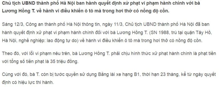 Bài liên quan: Vì sao Chủ tịch Hà Nội ký xử phạt nữ tài xế vi phạm nồng độ cồn ở phố Trần Cung? (VOV).