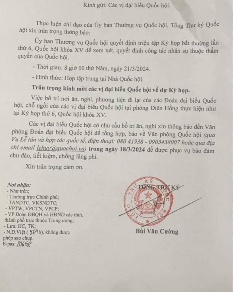 – Chỉ đạo Uỷ ban Thường vụ quốc hội triệu tập phiên họp đại biểu quốc hội bất thường vào lúc 8 giờ sáng 21-3-2023 để bỏ phiếu, ra nghị quyết miễn nhiệm chức Chủ tịch nước CHXHCN Việt Nam và cho thôi làm đại biểu Quốc hội khóa 15 đối với ông Võ Văn Thưởng.