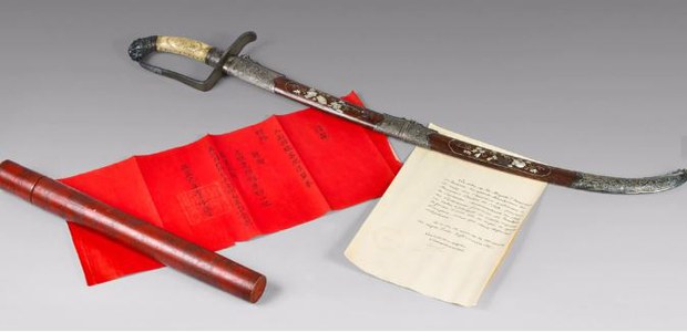 Trong số các bảo vật được đem bán đấu giá có thanh kiếm của vua Hàm Nghi (trị vì 1884-1885) tặng Tướng Brière de l’Isle (tổng chỉ huy quân đội viễn chinh Pháp ở Việt Nam, sau này là Thống đốc Senegal) vào năm 1885.