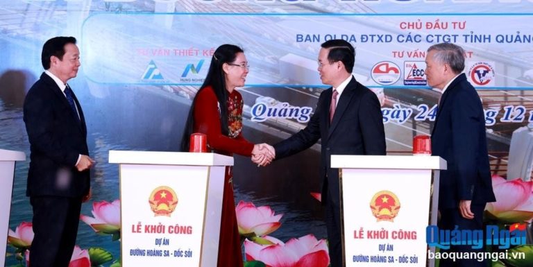 Các cháu xem ảnh bác gái Bùi Thị Quỳnh Vân và bác trai Võ Văn Thưởng bắt tay nhau rất khí thế, thể hiện sự đoàn kết giữa lãnh đạo Đảng và Nhà nước, giữa trung ương và địa phương để khởi công Dự án đường Hoàng Sa – Dốc Sỏi với chi phí 3.500 tỷ đồng.