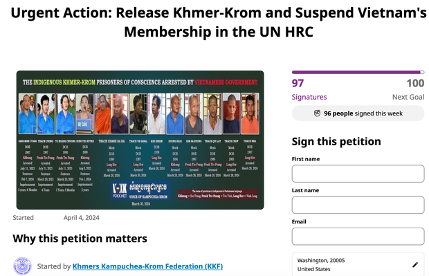 Thư ngỏ được đăng tải trên trang change.org vào ngày 4/4 để thu thập chữ ký, trong đó khẳng định “cuộc đàn áp gần đây của Việt Nam đối với cộng đồng người Khmer Krom bản địa đã đạt đến mức báo động, với nhiều báo cáo về các vụ bắt giữ tùy tiện, bỏ tù bất công và đàn áp tôn giáo.”