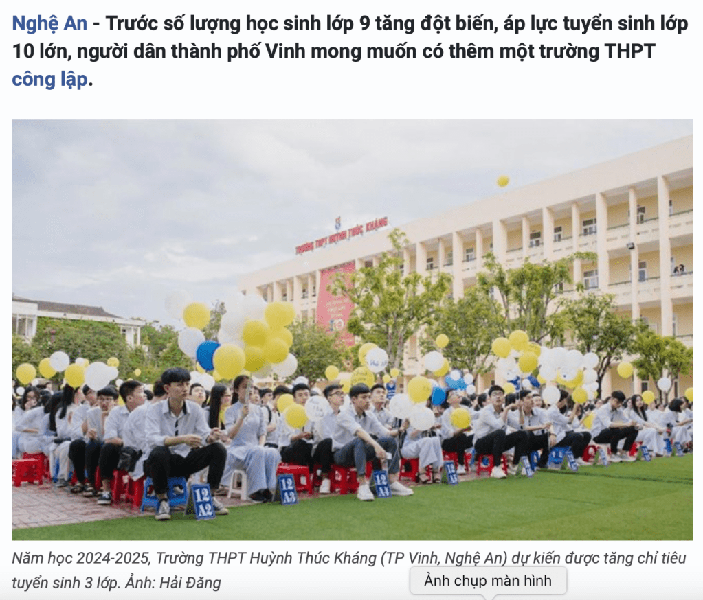 Từ năm 1976 đến thời điểm hiện tại, Vinh chỉ có ba trường THPT công lập. Nhưng ở Vinh còn có 6 trường dân lập, hai trường Dân tộc nội trú, và hai trường chuyên. Cho nên, nhiều người (bao gồm không ít lãnh đạo) cho rằng, ngoài 2.600 học sinh THCS vào ba trường THPT công lập, thì 3.400 học sinh còn lại sẽ học tập ở 6 trường dân lập. Thế là vẫn “đủ chỗ”, chứ không “thất học”.